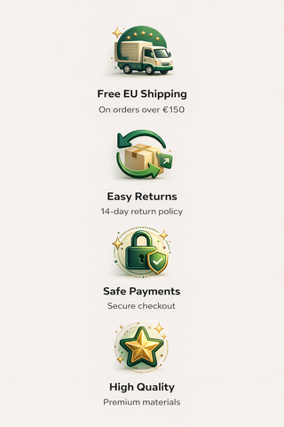 Set of icons and text describing shipping, returns, payments, and quality assurance on a white background.