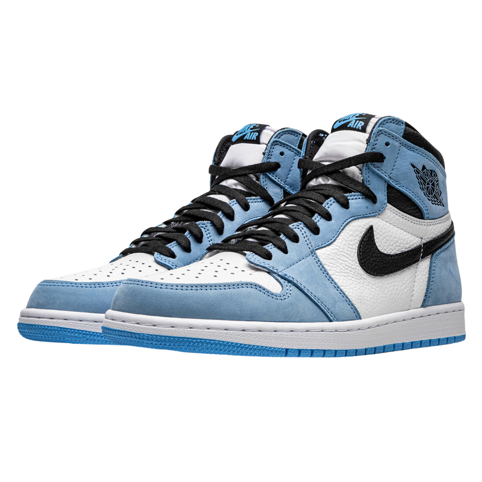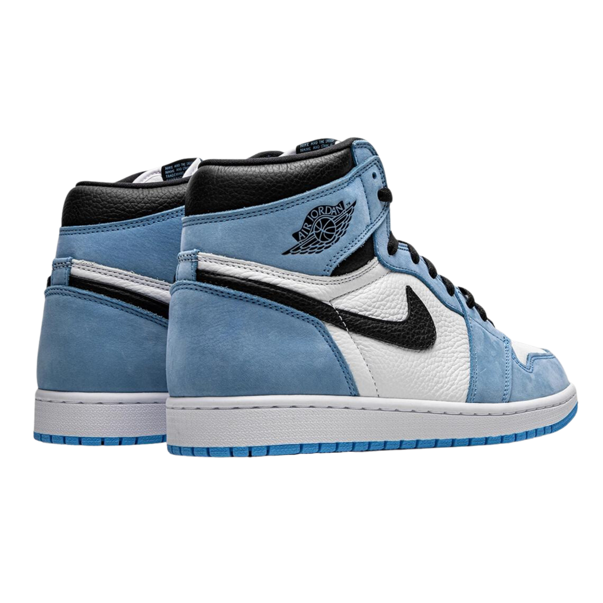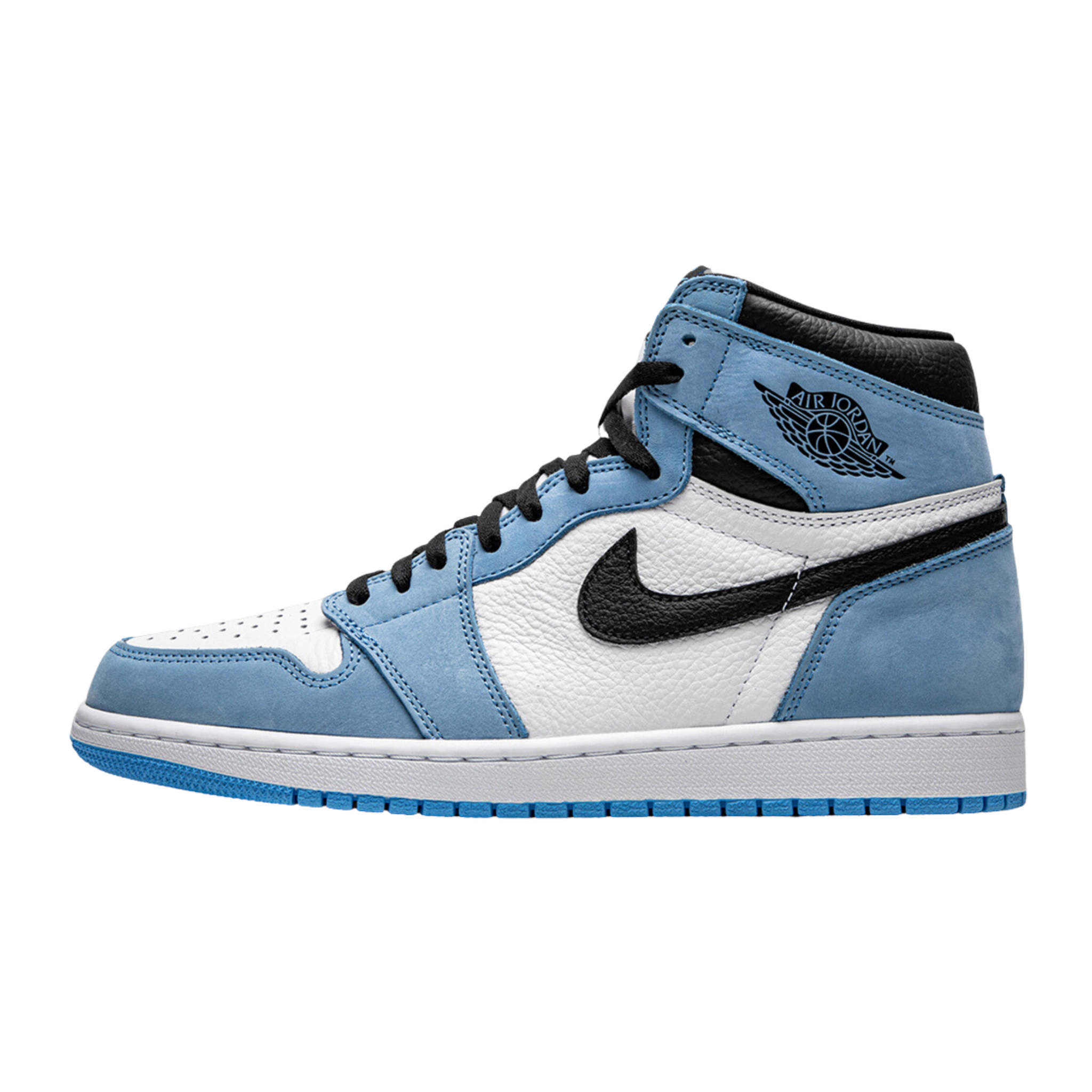 The Air Jordan 1 Retro High OG 'University Blue' features a familiar colour scheme that pays homage to Michael Jordan's alma mater, the University of North Carolina. The upper is made entirely of leather and has a white base with powder blue overlays and a black signature Swoosh. Matching black accents make their way to the collar, tongue tag and printed Wings logo on the lateral collar flap. The standard AJ1 outsole, which features multi-directional traction and a pivot point under the forefoot, gets a brighter shade of blue.