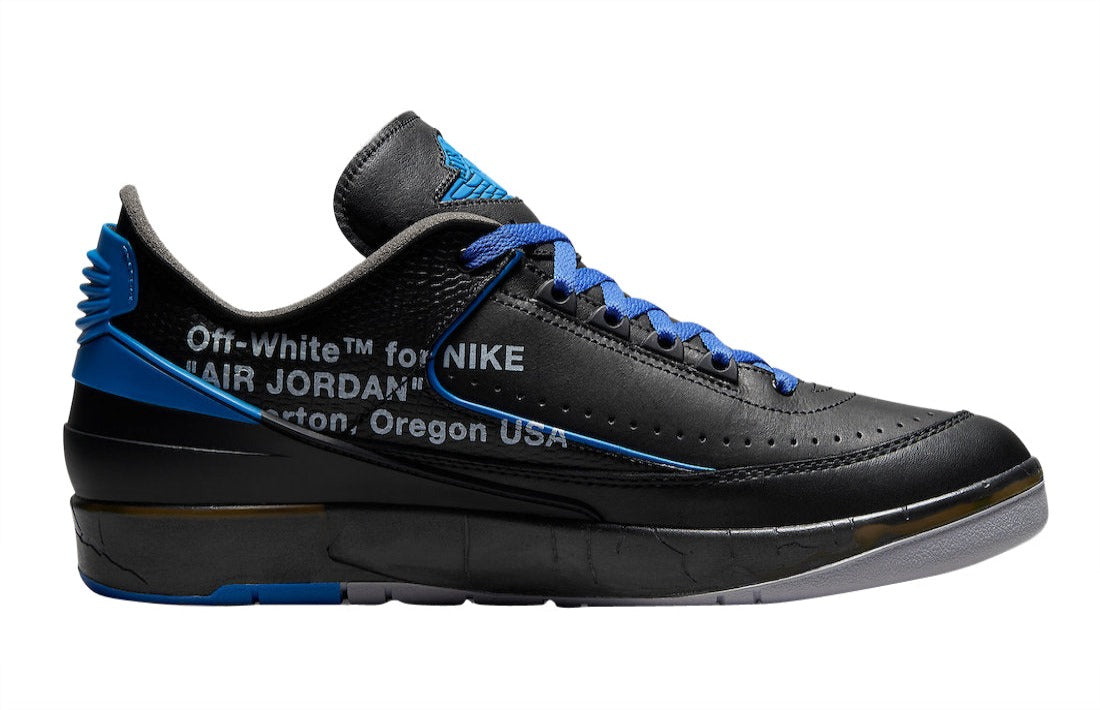 With the release of the Off-White x Air Jordan 2 Retro Low SP 'Black Varsity Royal,' Virgil Abloh gives a relatively unknown silhouette the Virgil Abloh treatment. The low-top is made of black leather with a tonal lizard-textured overlay and royal blue accents. They land on the moulded heel panel, midfoot piping and exposed-foam tongue, featuring the Jordan Wings logo for an OG touch. Michael Jordan's signature is scrawled across the lateral side, while Virgil Abloh stamps the laces with a plastic zip tie, medial-side Helvetica text, and the text 'SHOELACES'.