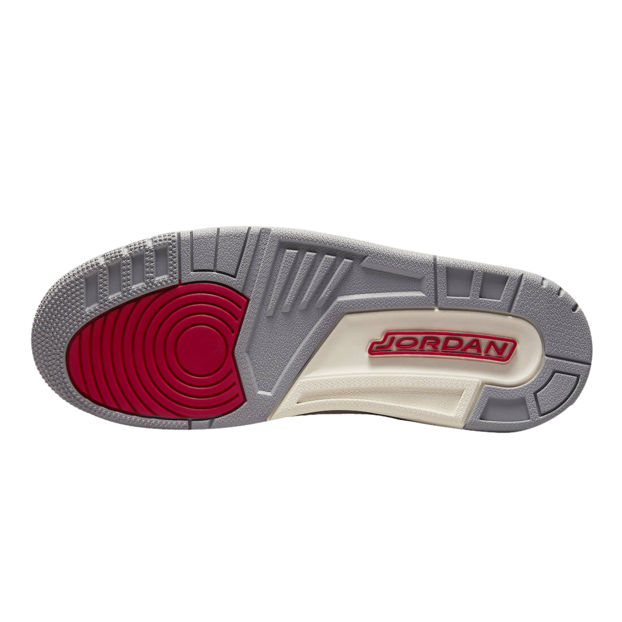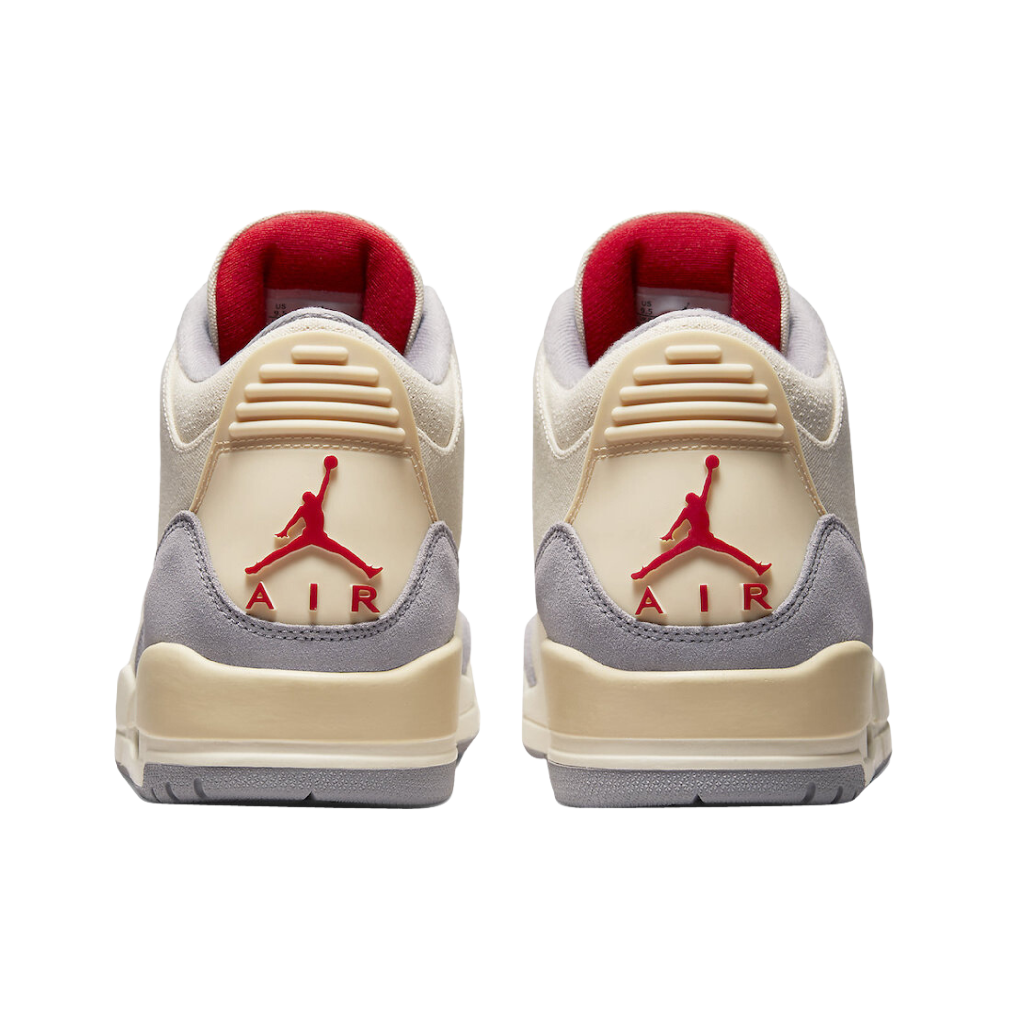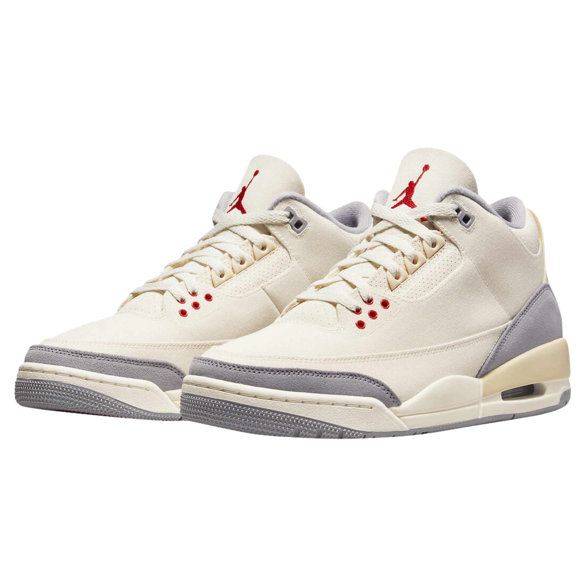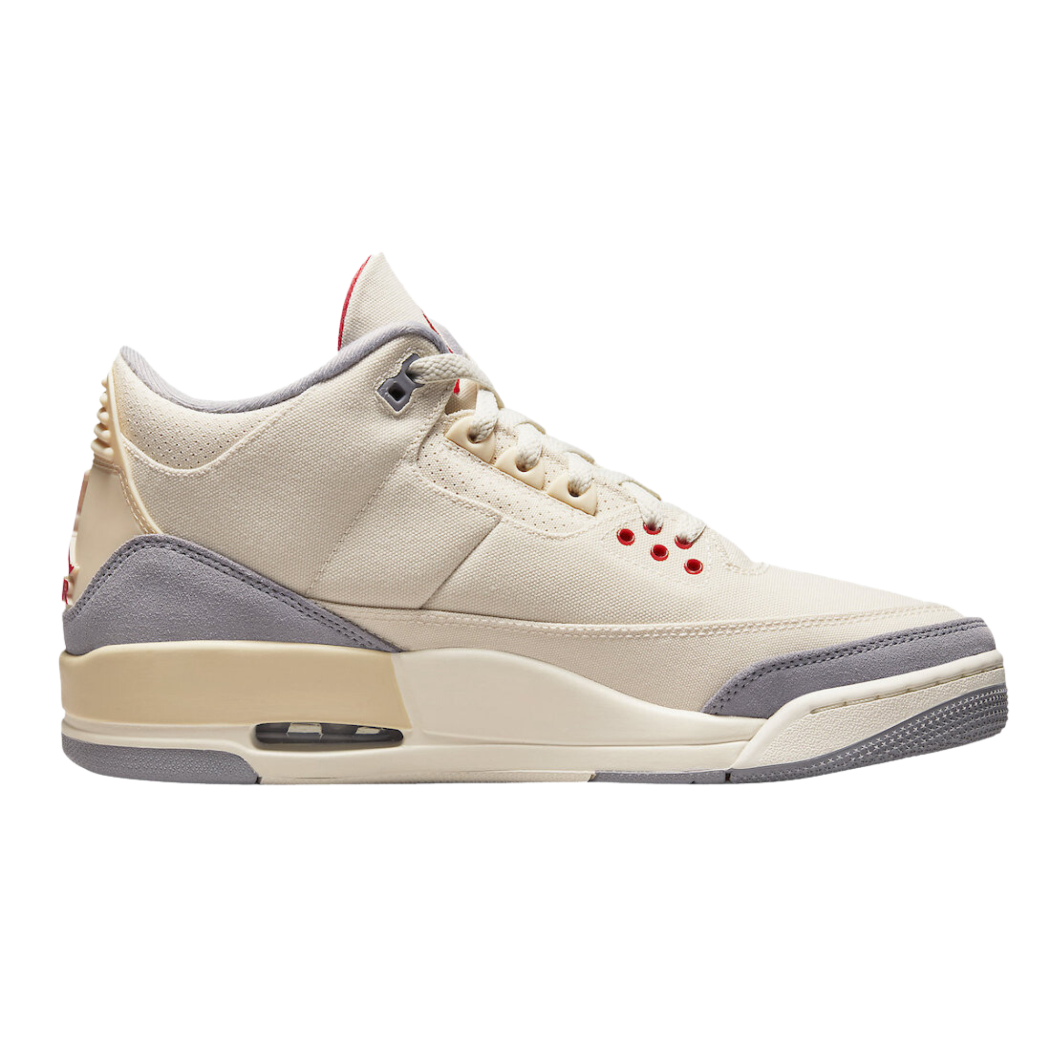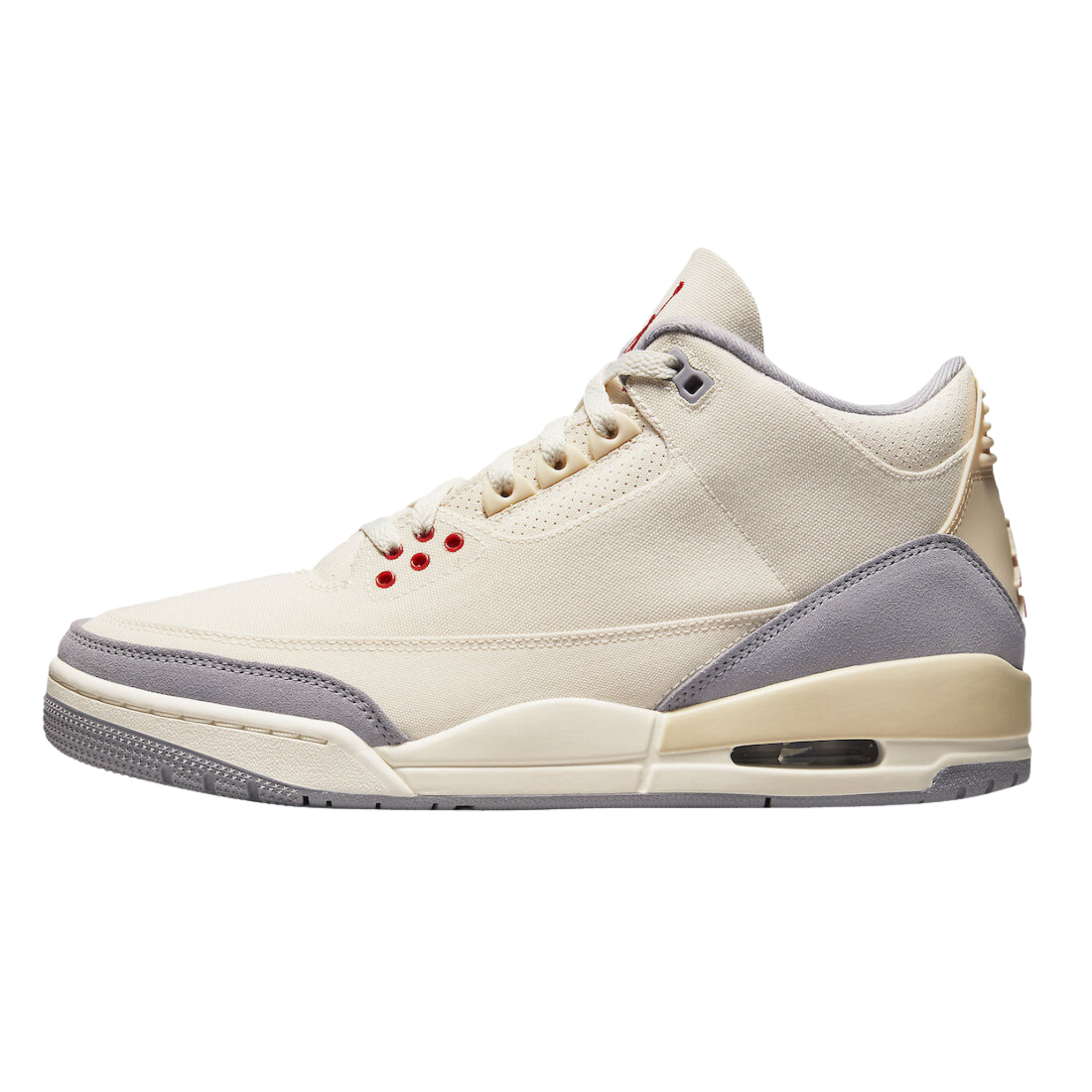 The Air Jordan 3 Retro ‘Muslin’ updates Tinker Hatfield’s original 1988 design with a recrafted build. In lieu of traditional leather, the upper is constructed from Muslin canvas with forefoot and heel overlays in Cement Grey suede. University Red accents land on the sneaker’s lower eyelets, as well as Jumpman branding hits atop the tongue and molded heel panel. The sneaker rides on an off-white polyurethane midsole with visible Air-sole cushioning in the heel. Underfoot, a durable grey rubber outsole provides grippy traction.