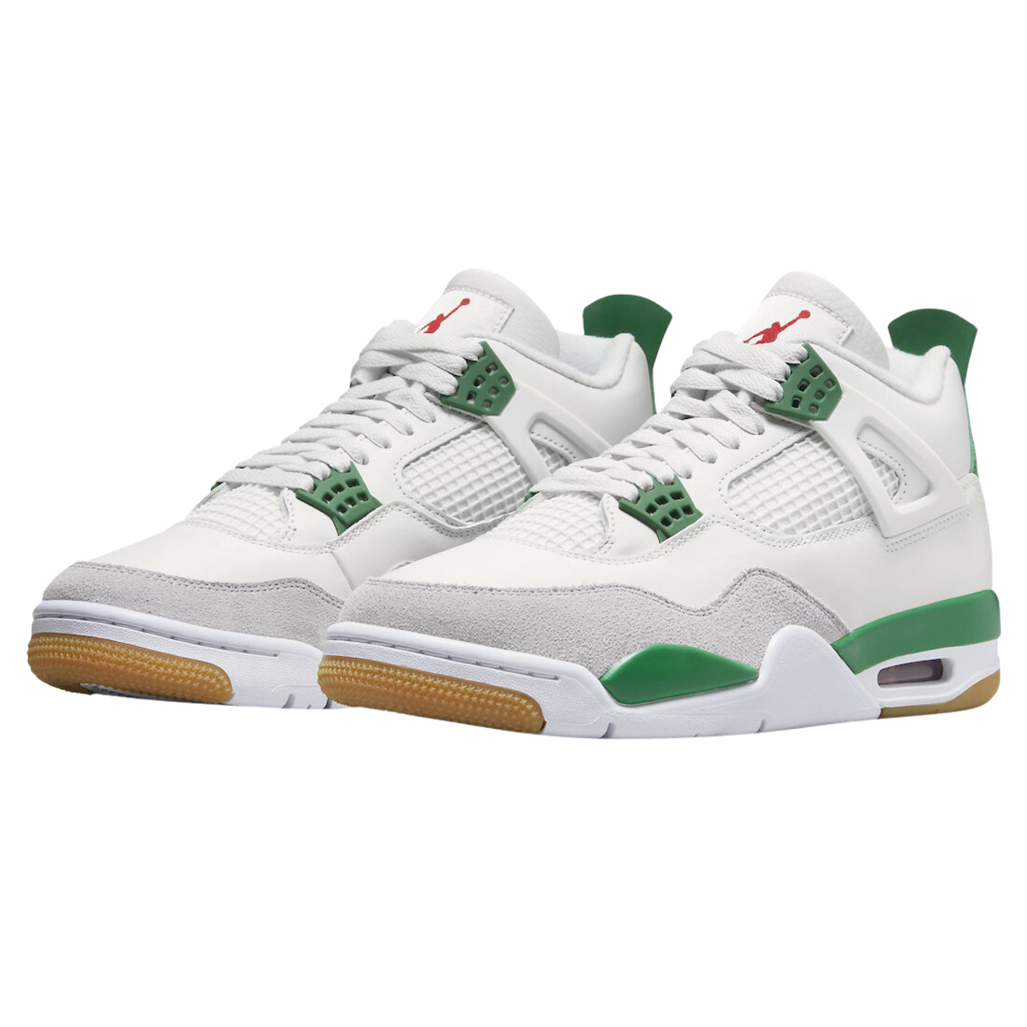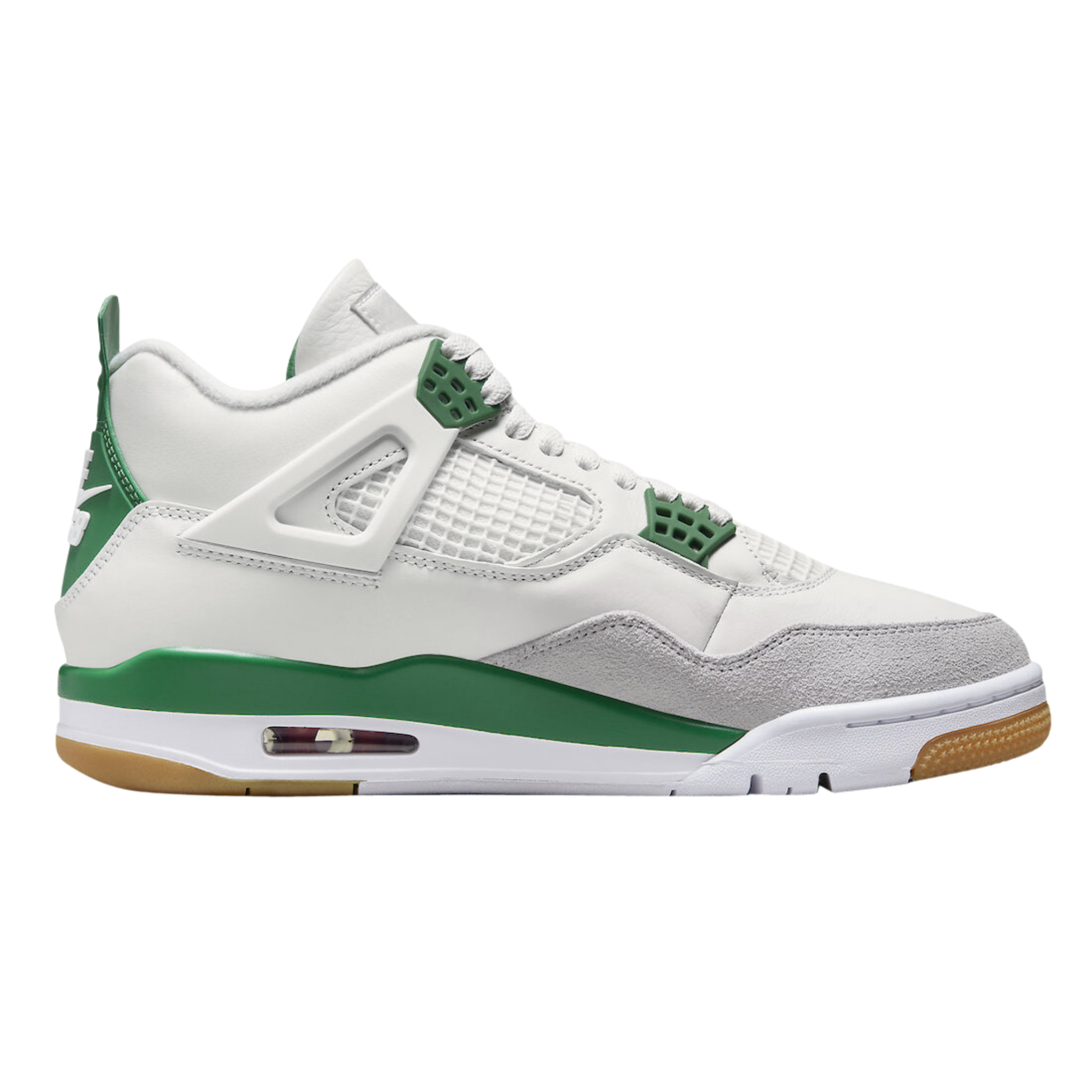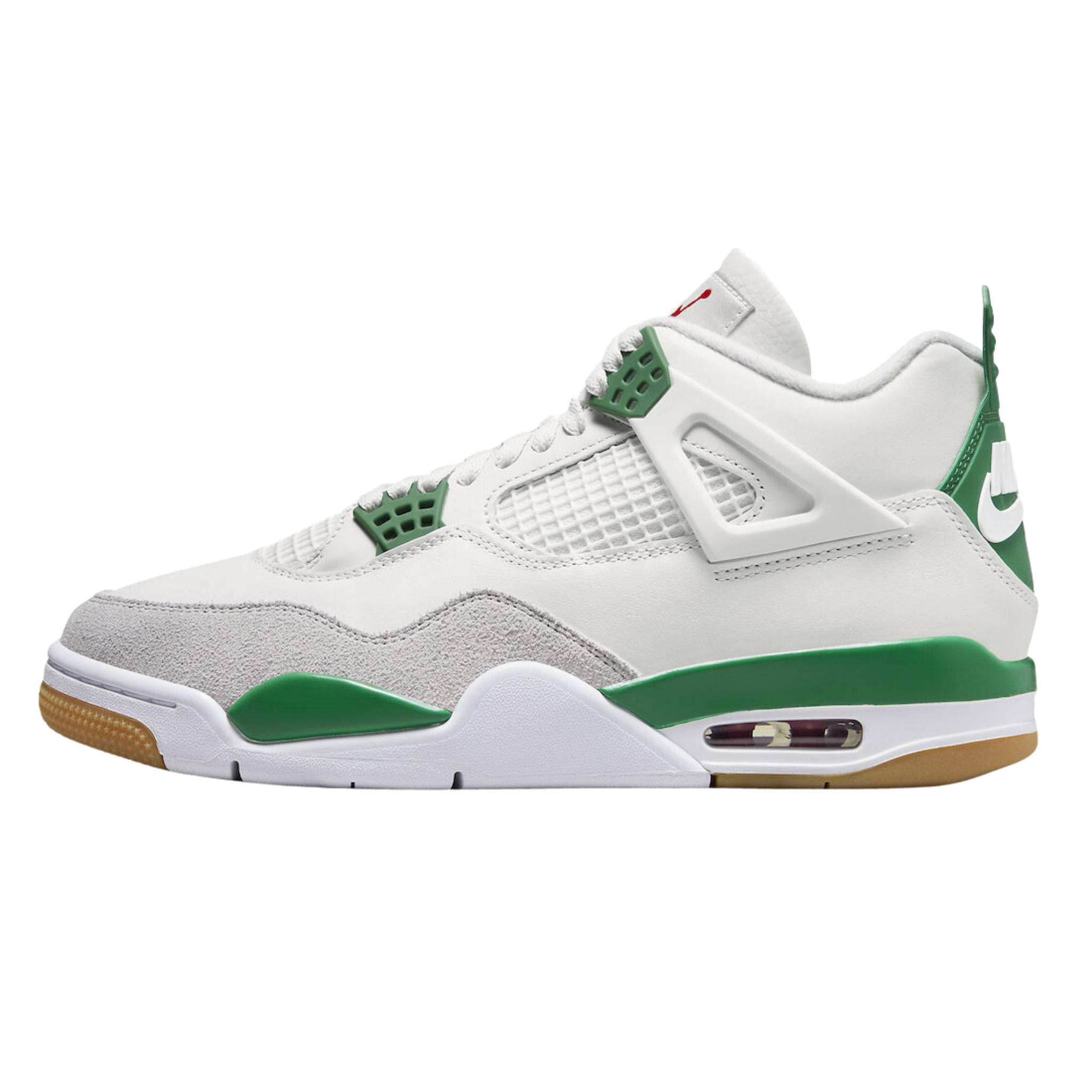 With the debut of the Jordan 4 Retro SB Pine Green, Nike SB's partnership with Jordan helps develop the ultimate sneaker for the skatepark to the basketball court. White leather and Neutral Grey suede were used for the upper and mudguard of the Jordan 4 Retro SB Pine Green. The red air unit stands out against the white and pine green midsole of the limited edition sneakers. A gum outsole was employed by Nike to help skateboarders have more traction.