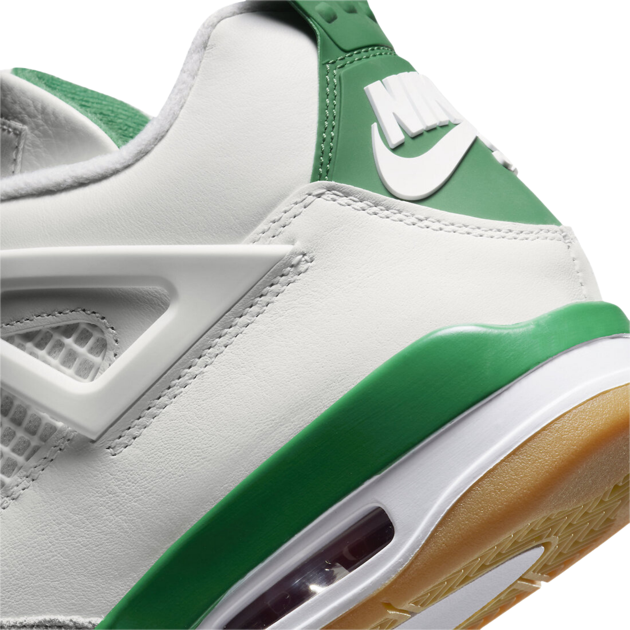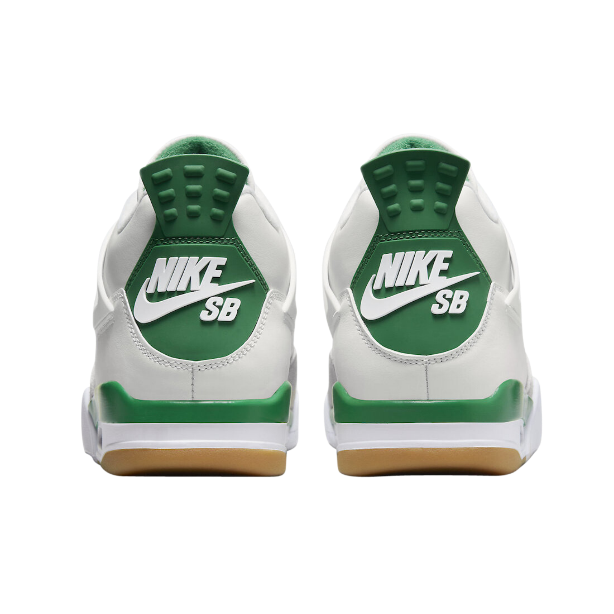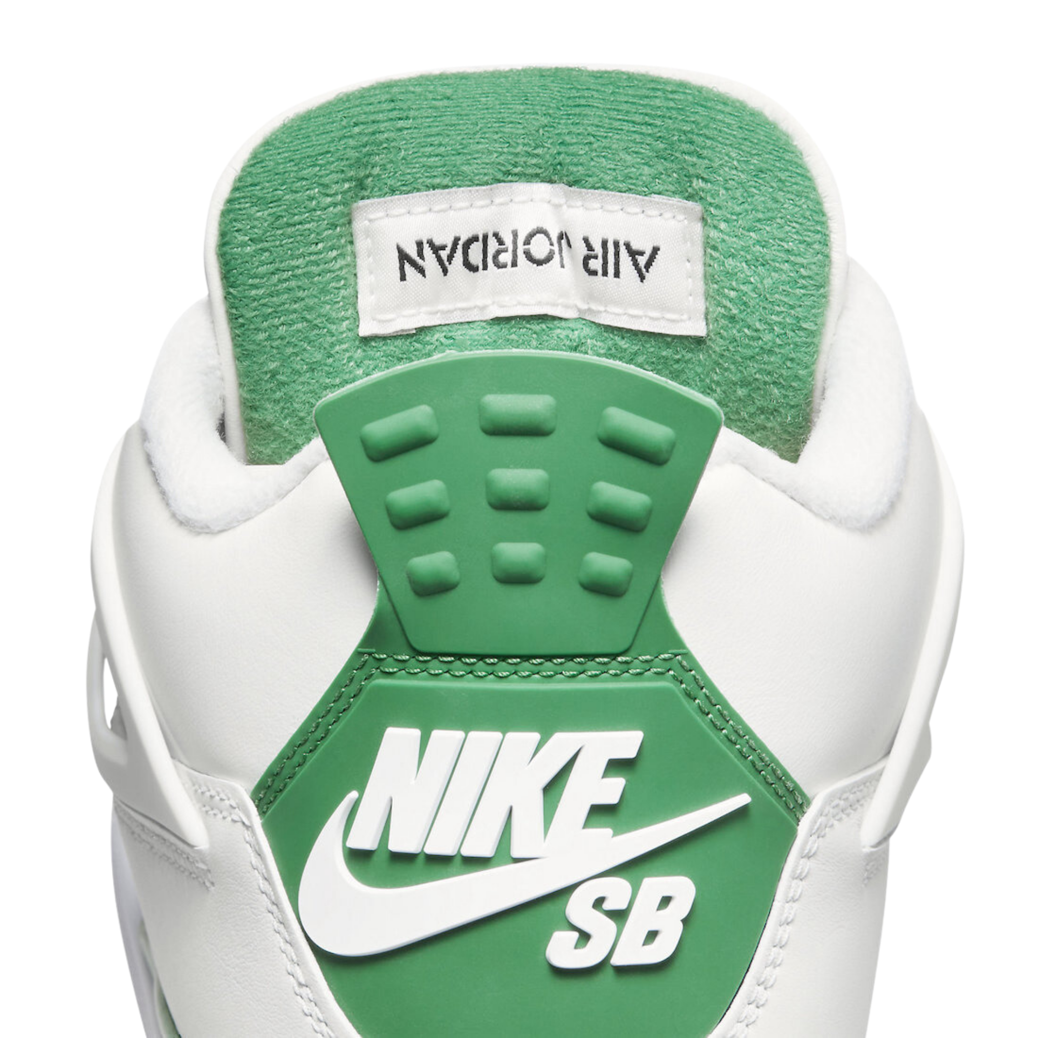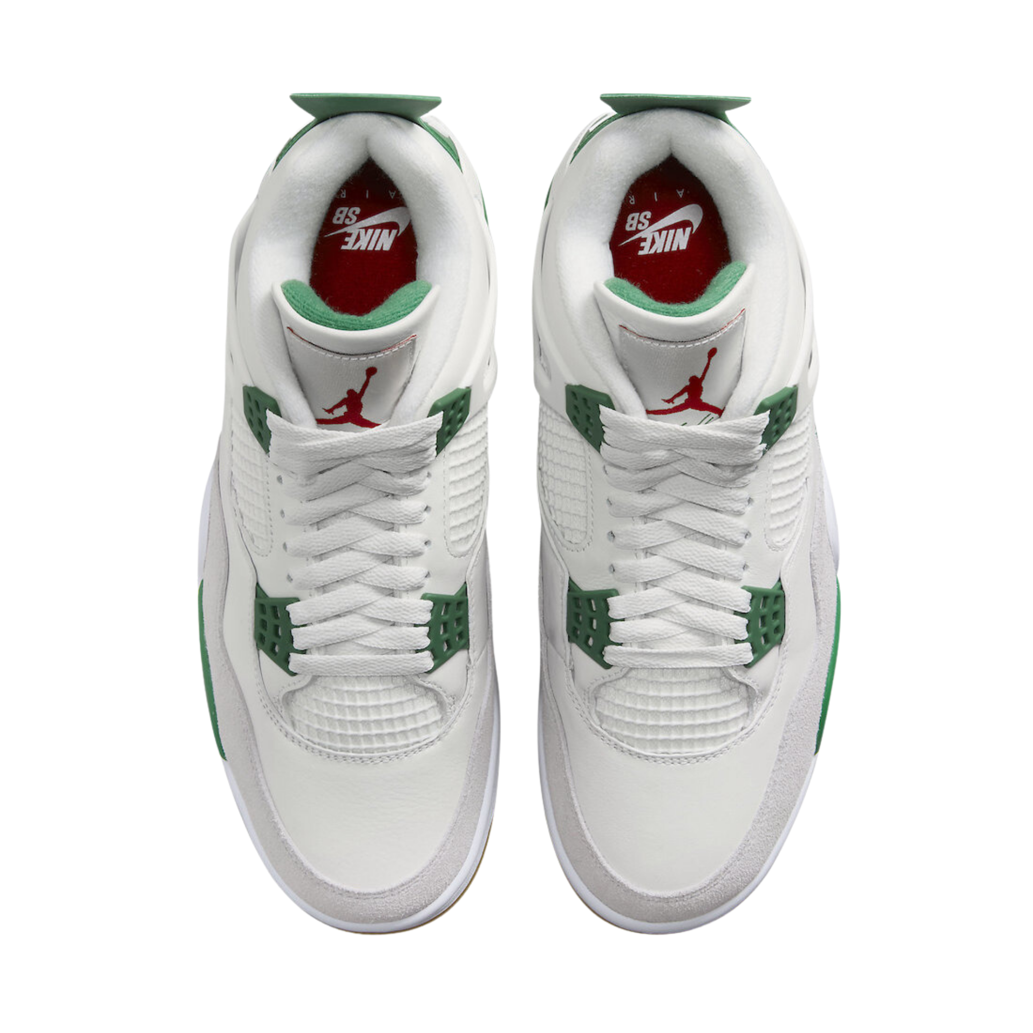 With the debut of the Jordan 4 Retro SB Pine Green, Nike SB's partnership with Jordan helps develop the ultimate sneaker for the skatepark to the basketball court. White leather and Neutral Grey suede were used for the upper and mudguard of the Jordan 4 Retro SB Pine Green. The red air unit stands out against the white and pine green midsole of the limited edition sneakers. A gum outsole was employed by Nike to help skateboarders have more traction.