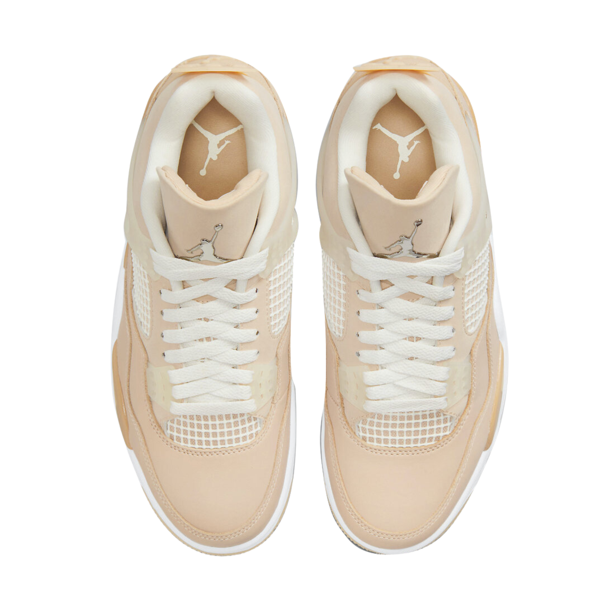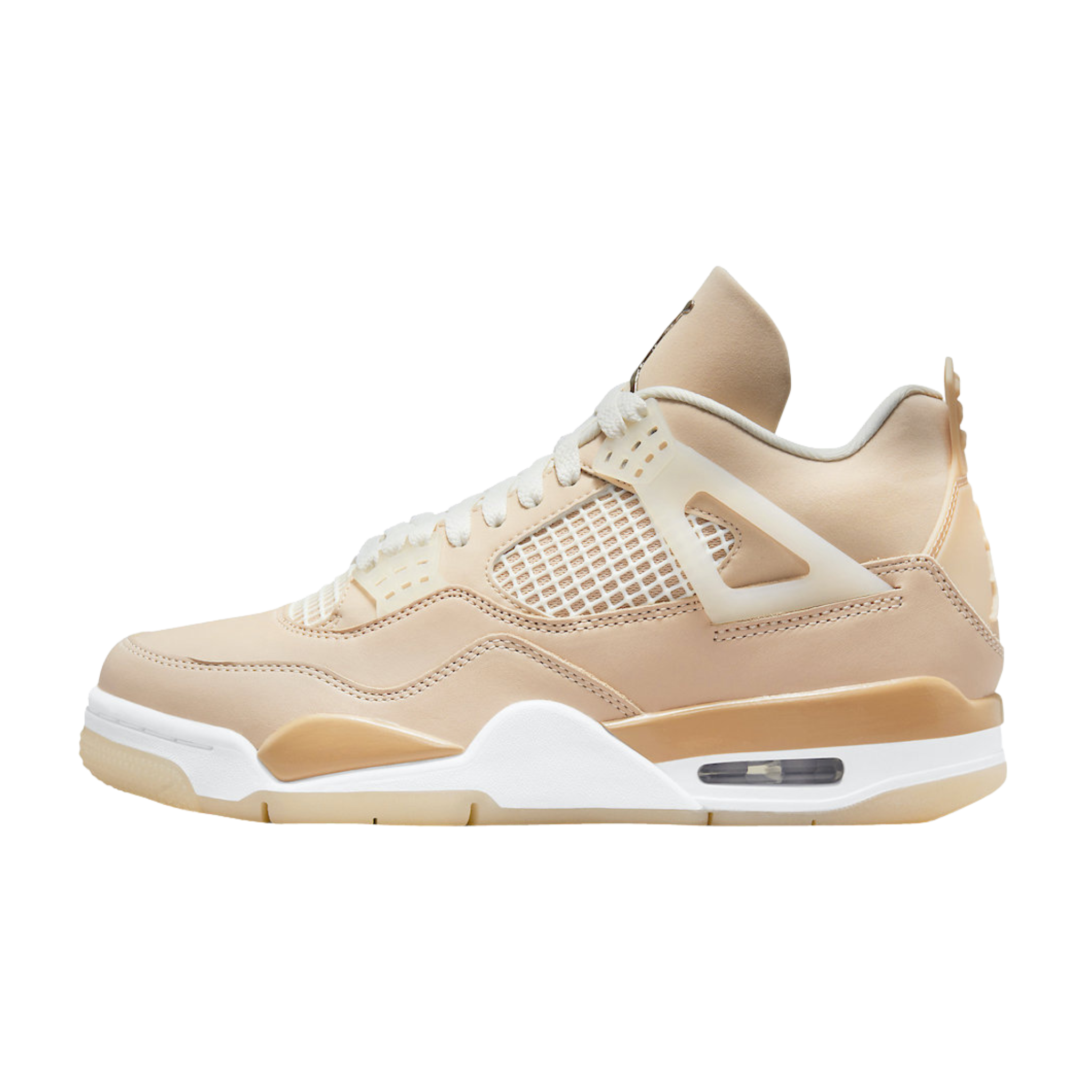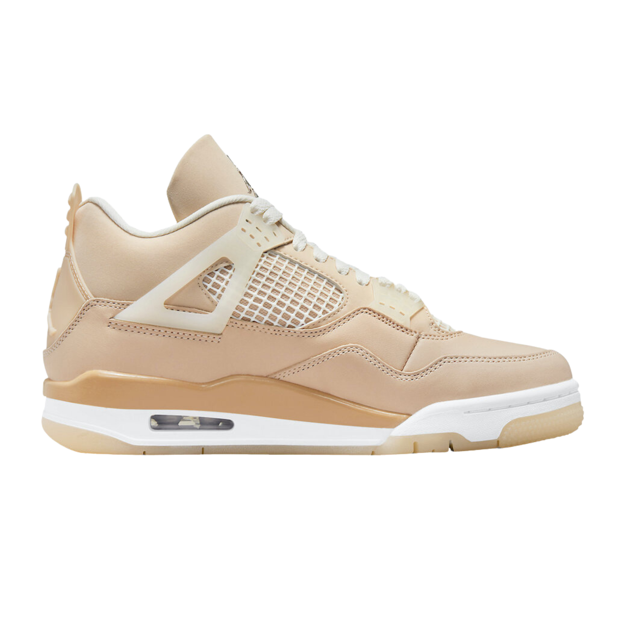 The women’s Air Jordan 4 Retro ‘Shimmer’ offers a subdued take on the classic silhouette forever tied to ‘The Shot.’ A monochromatic tan finish suffuses the leather upper, featuring structural wings, molded eyelets and quarter panel netting for enhanced breathability. The neutral color scheme is enlivened by a metallic silver Jumpman atop the tongue. Lightweight cushioning arrives via a polyurethane midsole, fitted with visible Air sole cushioning in the heel and supported by a herringbone-tread outsole.