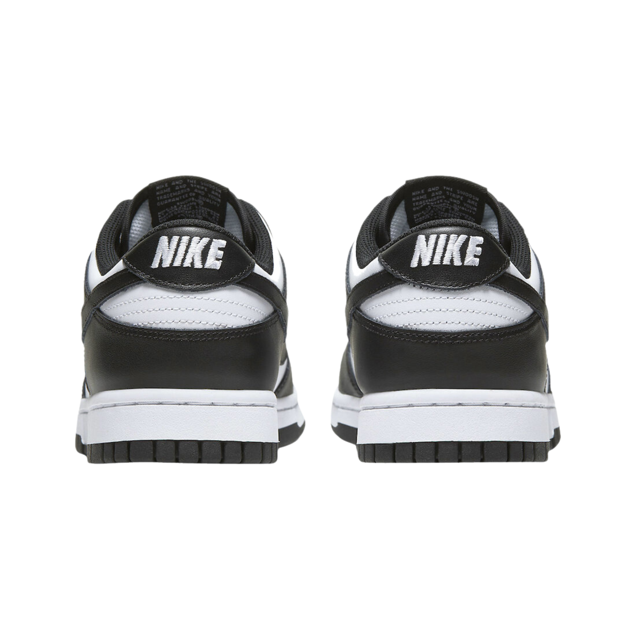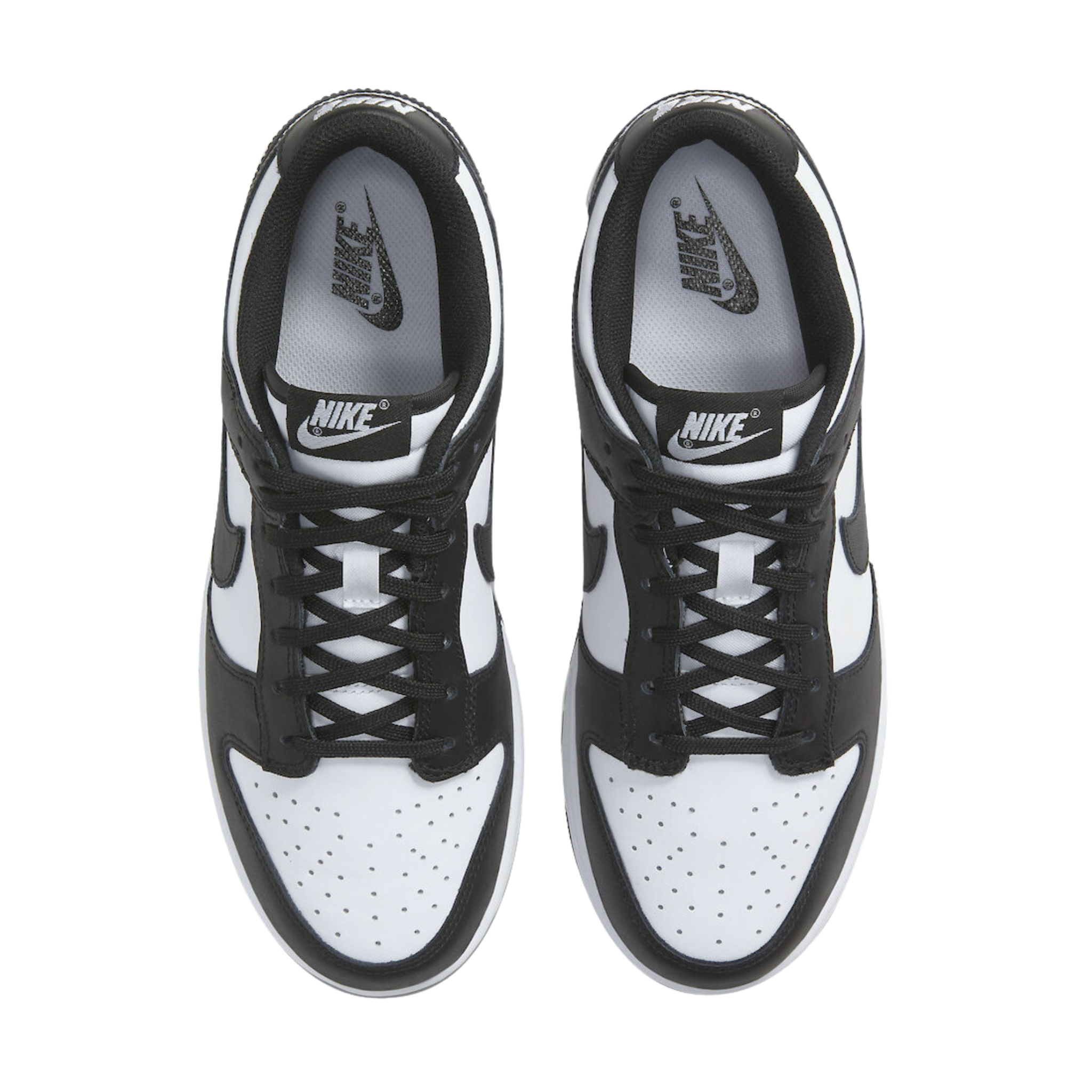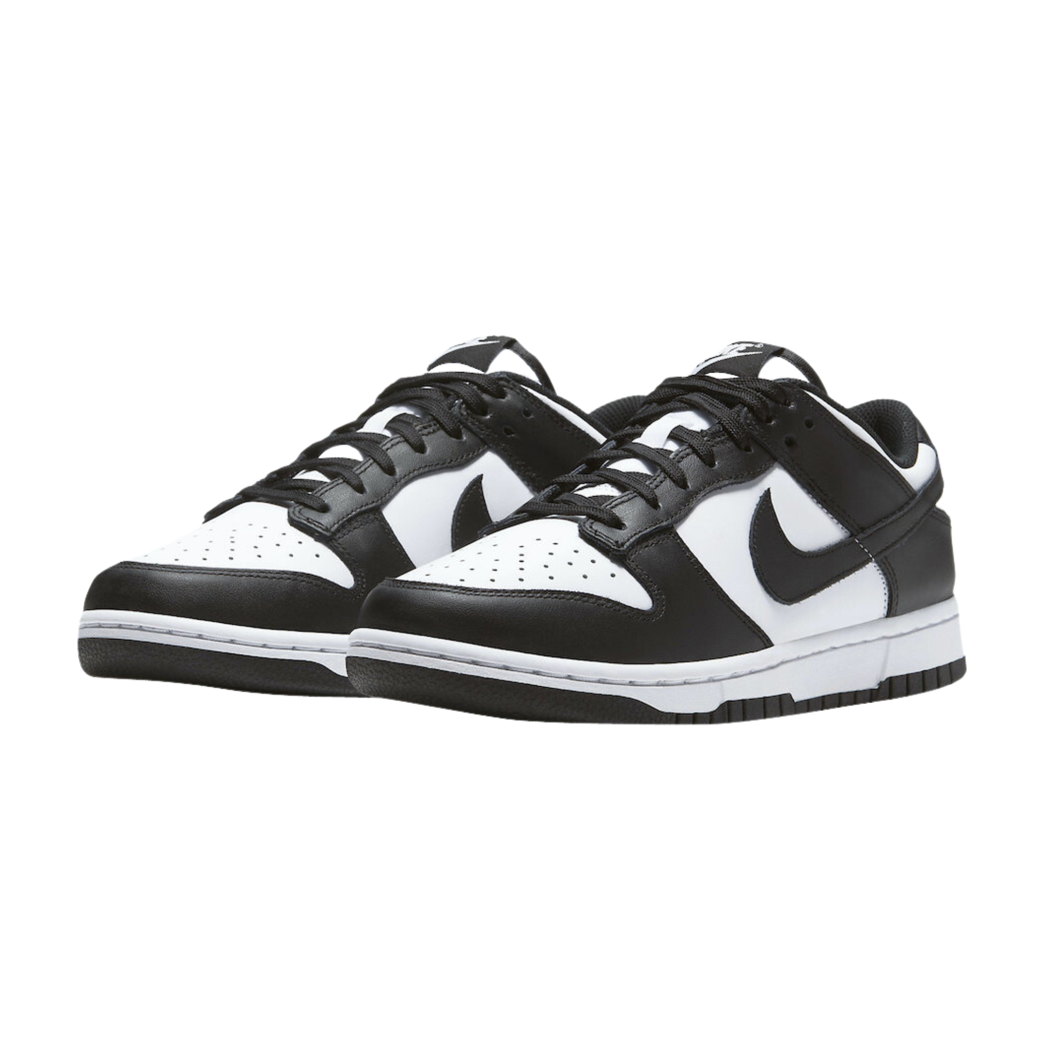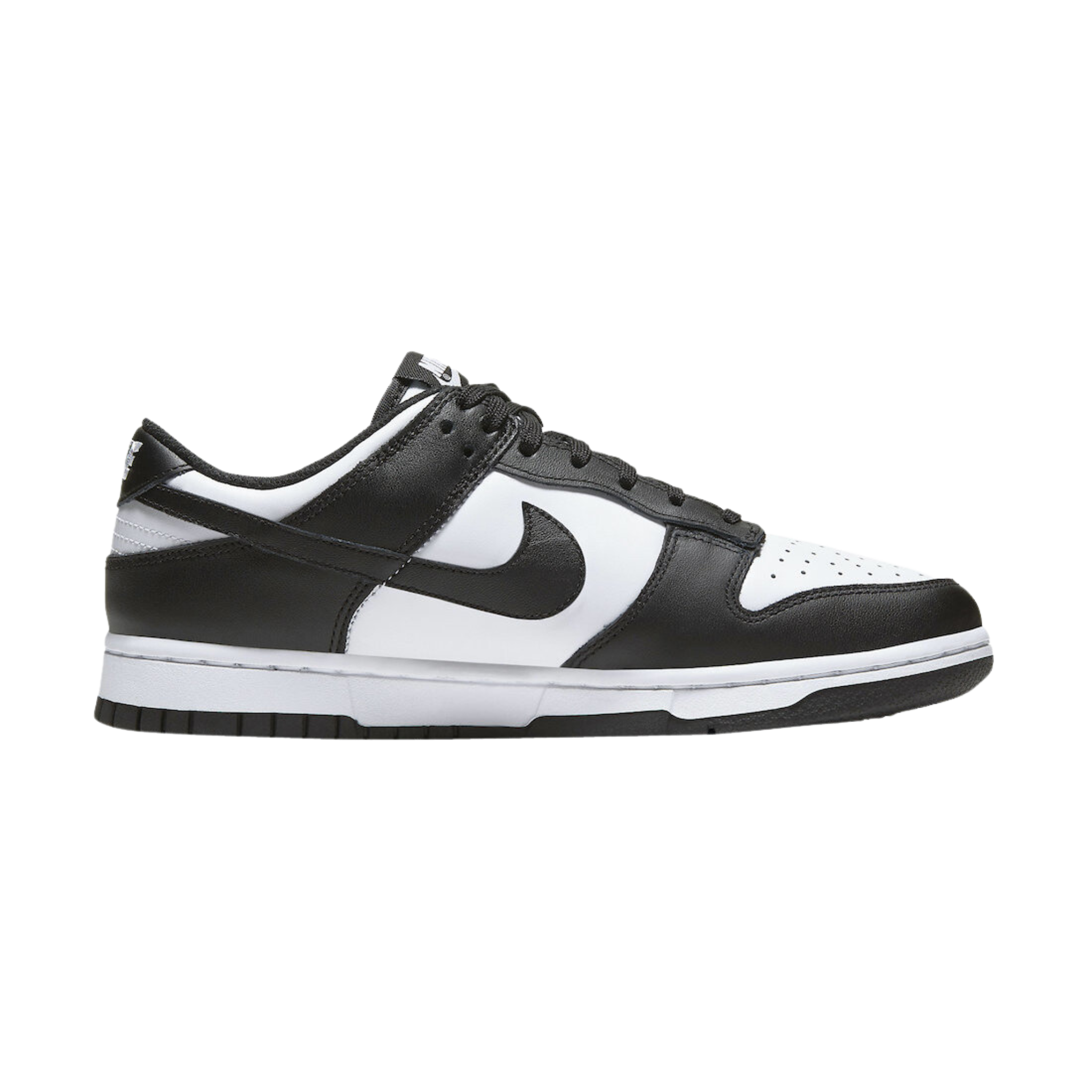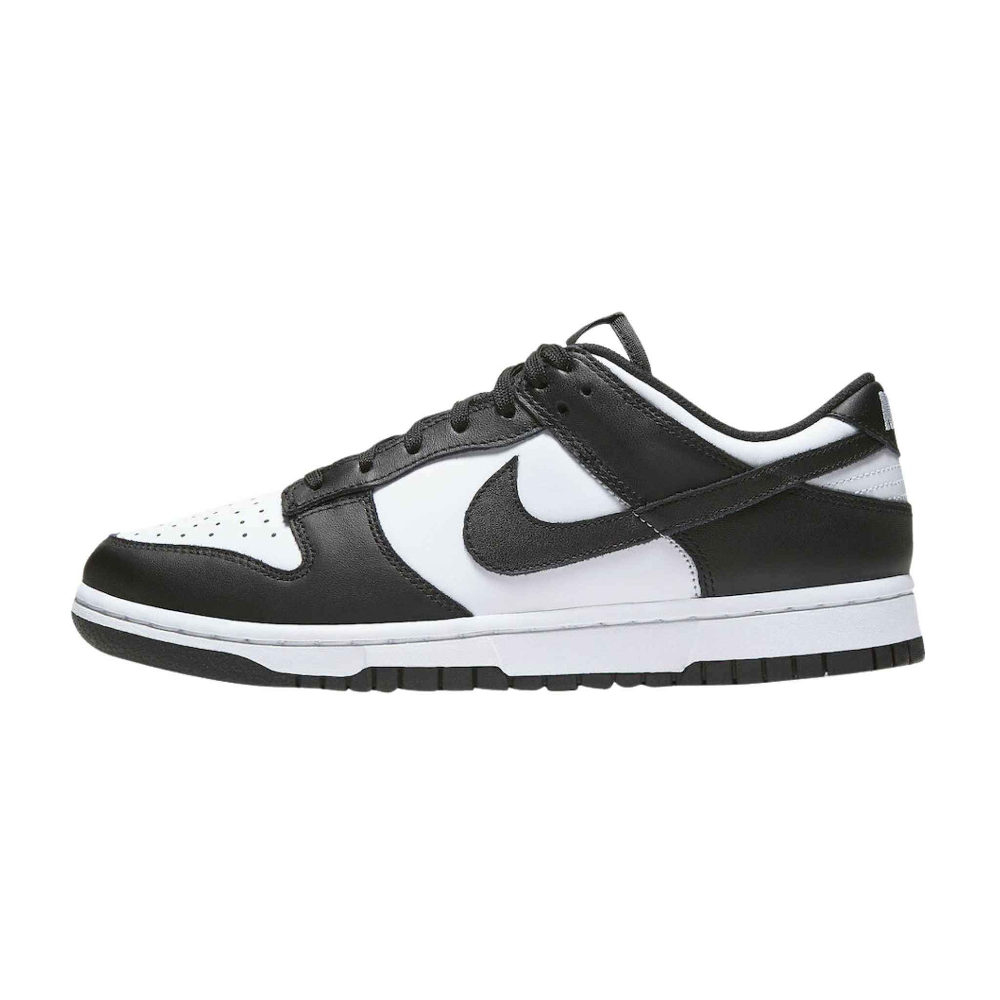 The Nike Dunk Low 'Black White' features a two-tone colour scheme that highlights the classic model's clean lines, which were conceived by designer Peter Moore and are responsible for the shoe's seamless transition from the hardwood to the street. The leather upper combines a white base with contrasting black overlays that wrap around the toe and heel. On both the woven tongue tag and heel tab, Nike branding in white stands out in relief against a black backdrop.