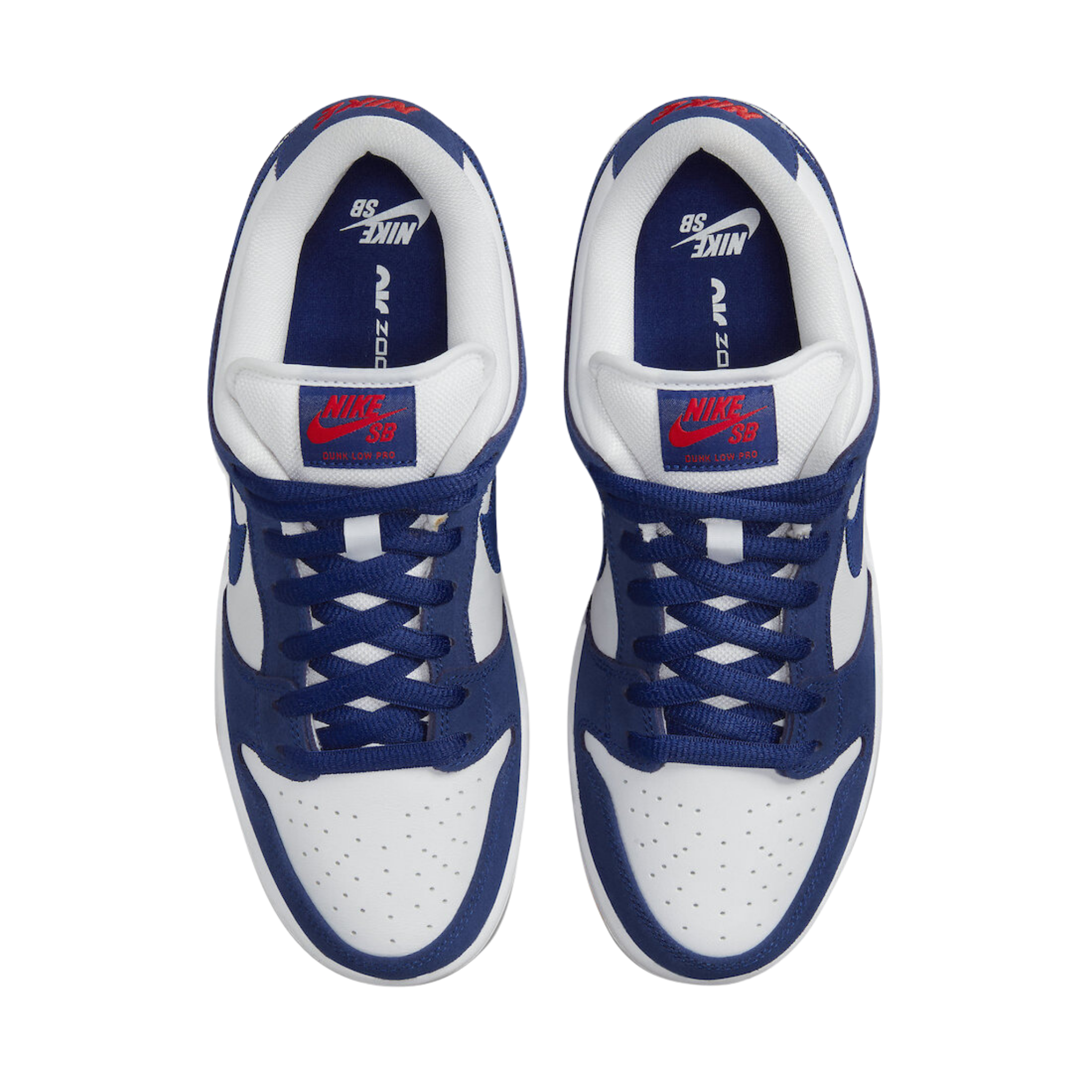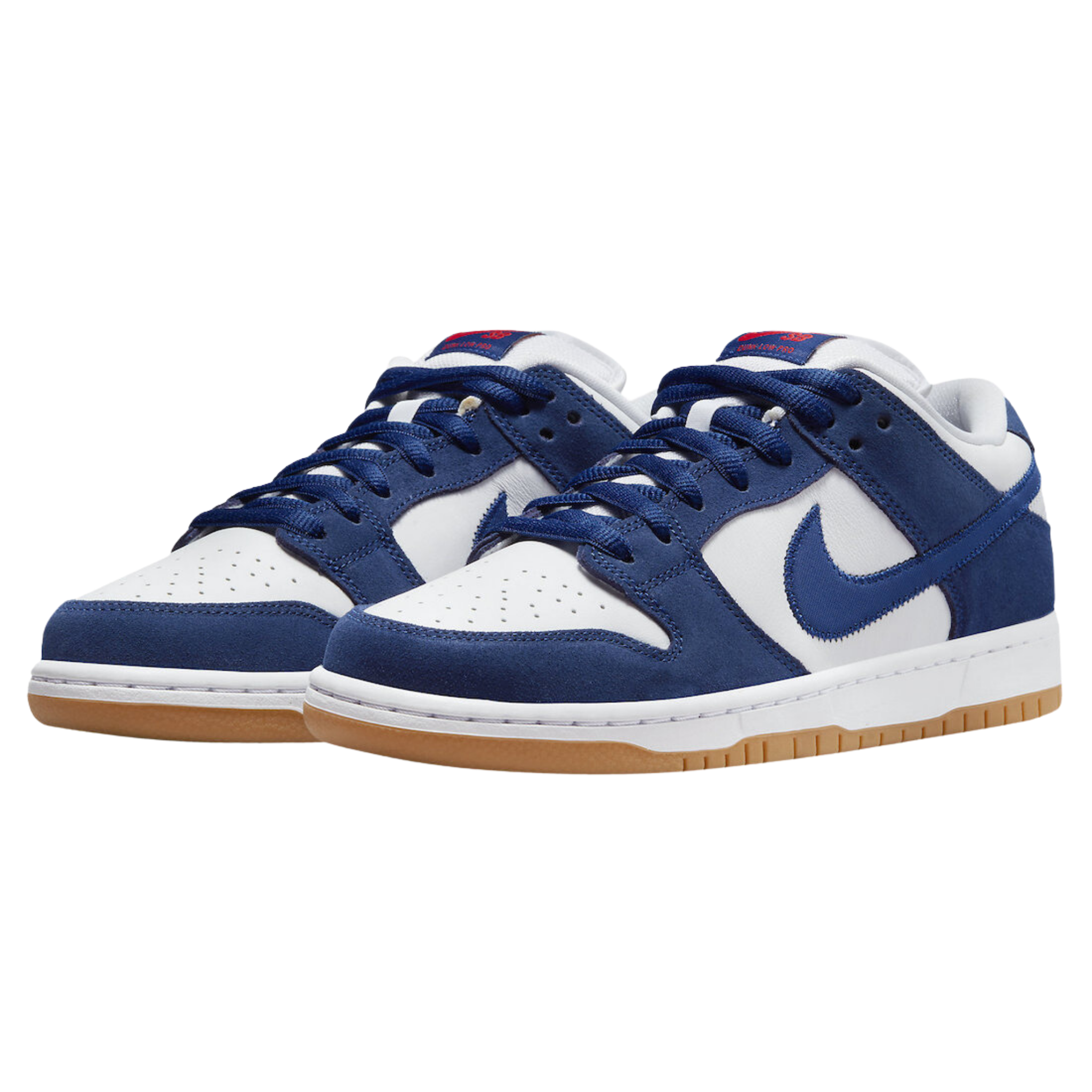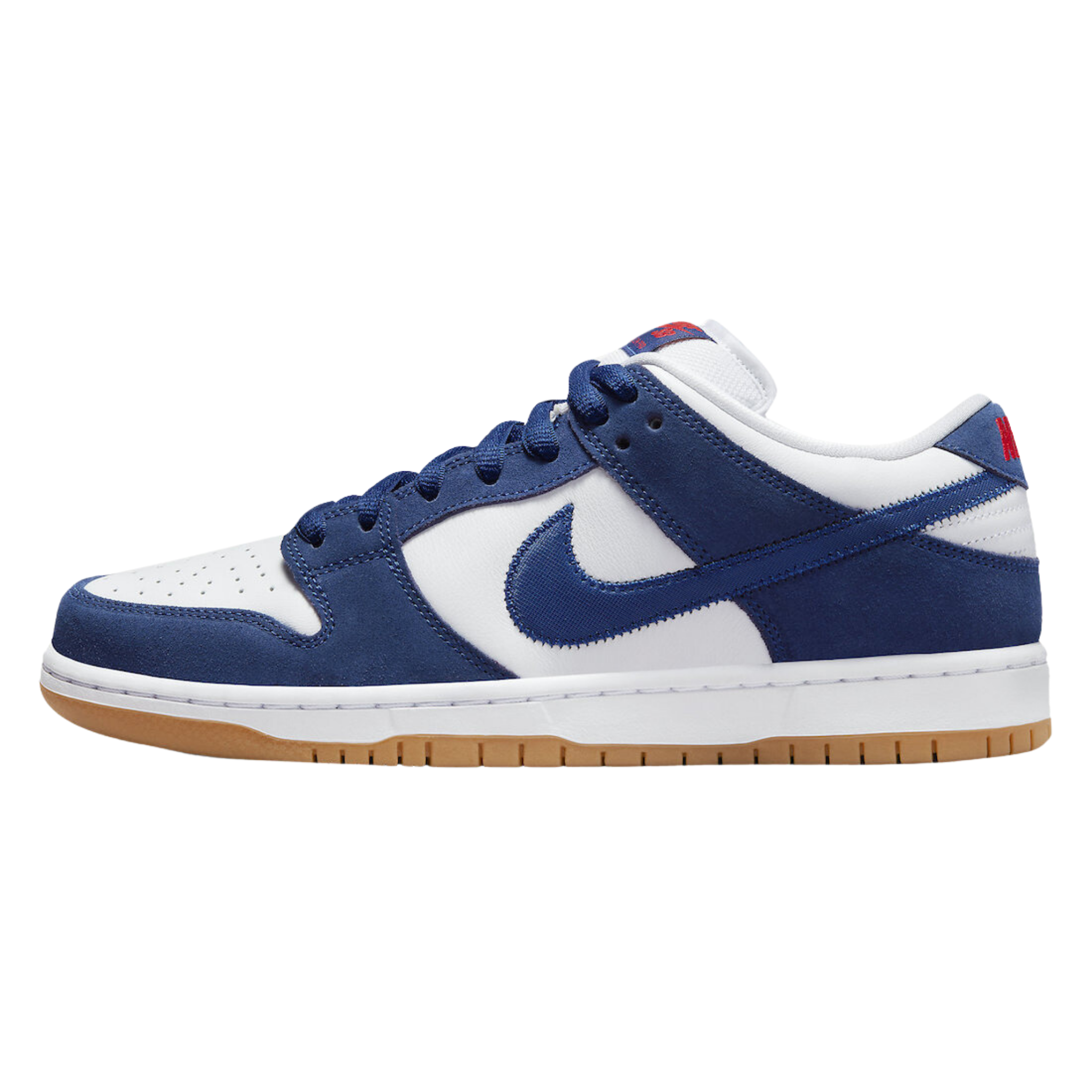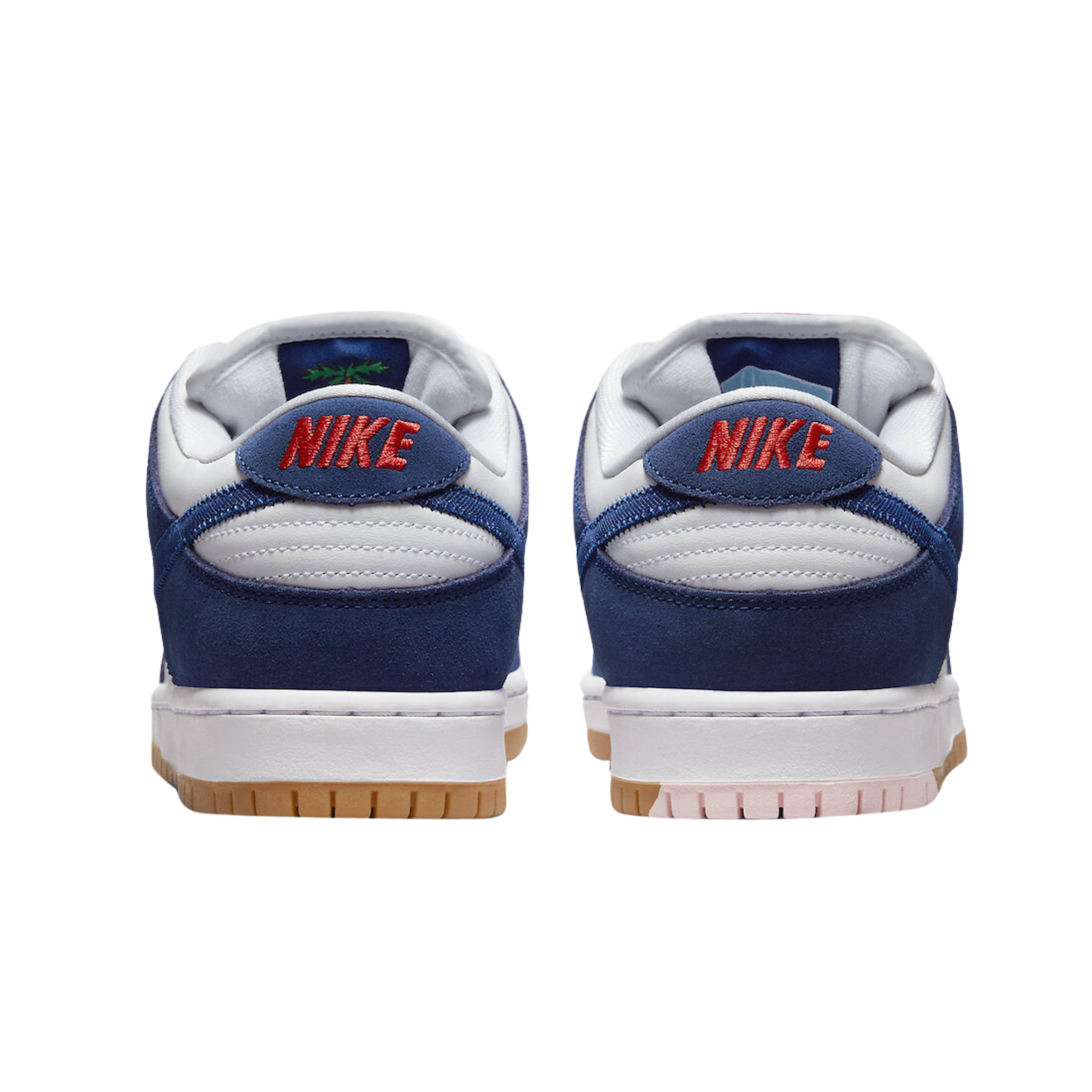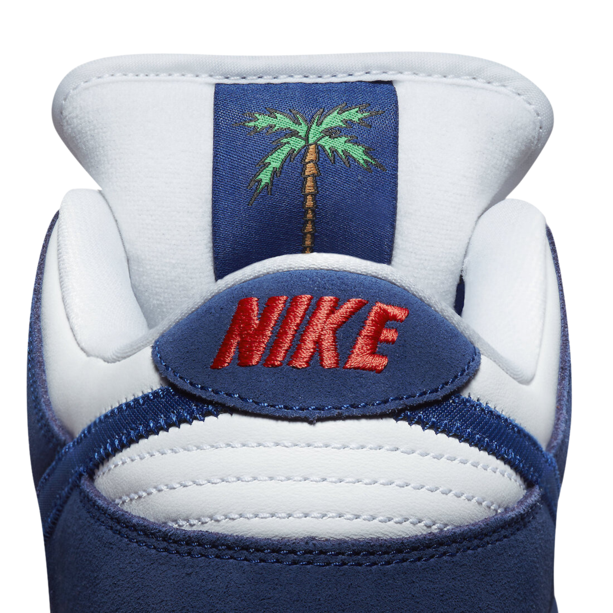The Nike Dunk Low SB ‘Los Angeles Dodgers’ features colors and details that pay homage to the storied MLB franchise. Sneaker features a White leather base with Dodger Blue suede overlays and Red branded tongues and heels. Other notable details includes palm trees and the “Welcome to Dodger Stadium” graphics on the inner tongue tags. A White midsole atop a Gum rubber outsole with Pink bubble gum marks on the right heel completes the design.