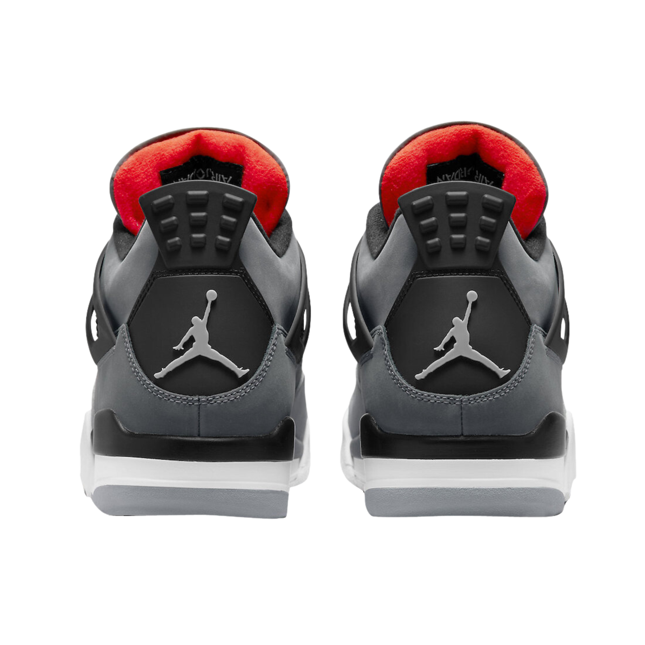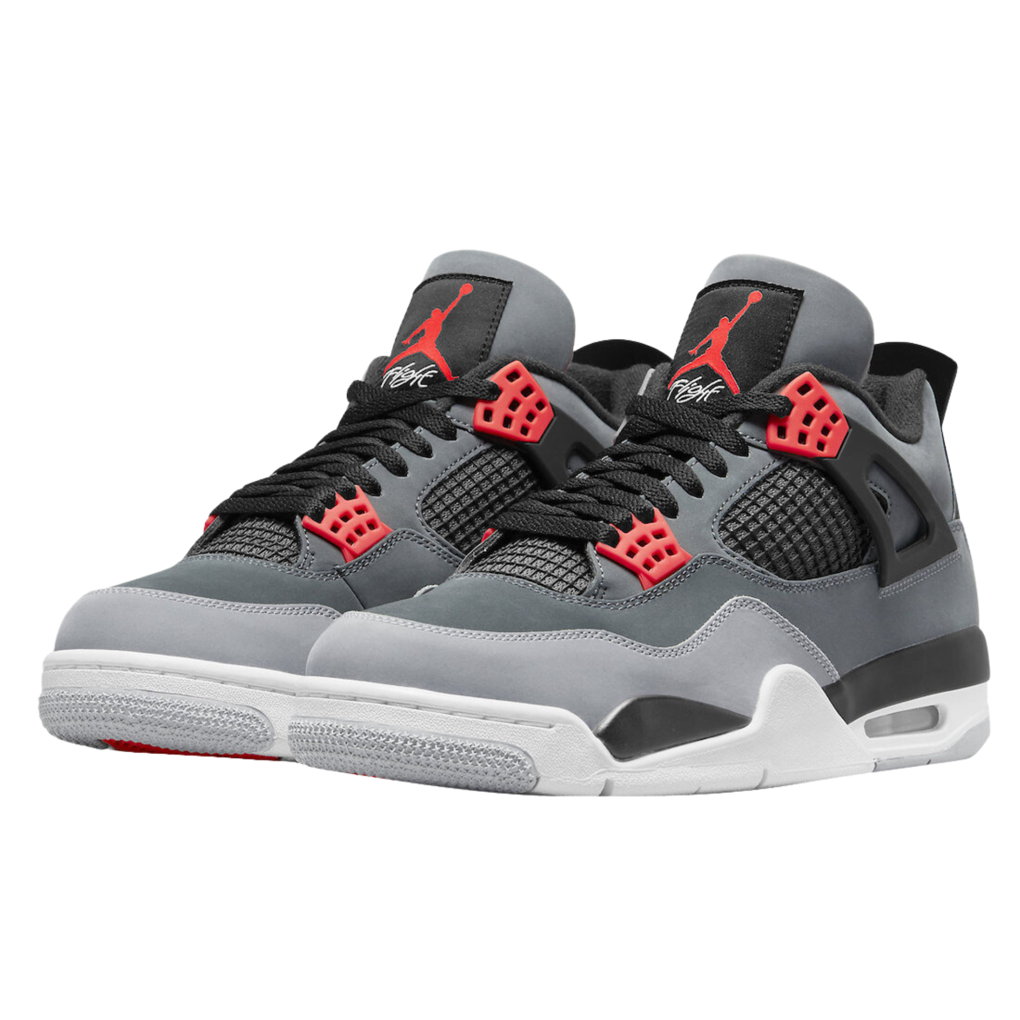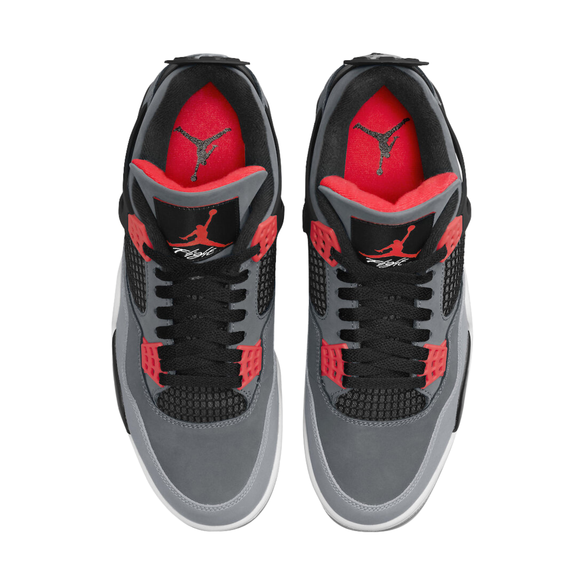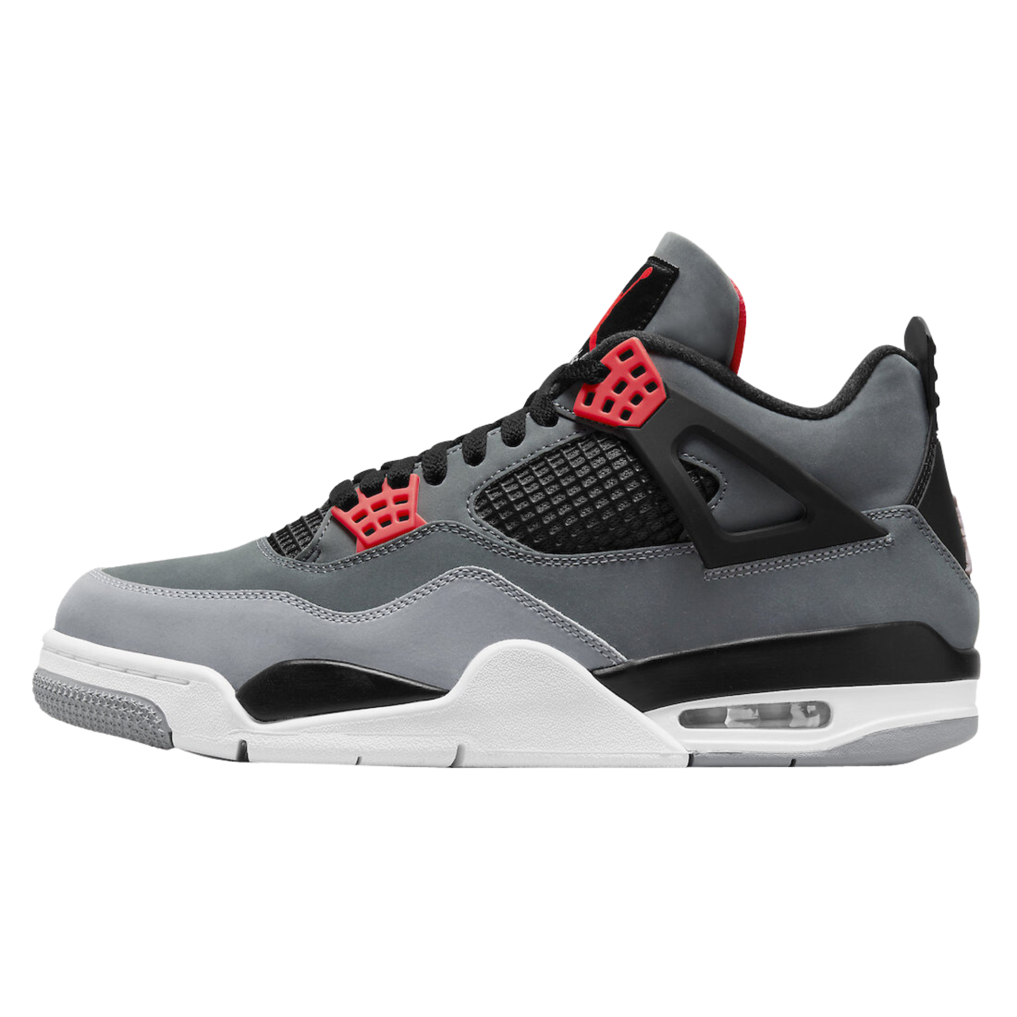 The Air Jordan 4 Retro "Infrared" features distinctive color blocking that recalls the "Green Glow" AJ4 release from 2013. The upper is crafted from smooth nubuck in a charcoal finish. Also, a lighter shade of grey distinguishes the forefoot overlay, while black accents land on the quarter panel netting, structural wings and Jumpman-branded heel tab. Underfoot, the midsole is dressed in a two-toned monochromatic look that goes well with the rest of the shoe’s colourway. Rounding off the Air Jordan 4 Infrared is an understated white and grey outsole.