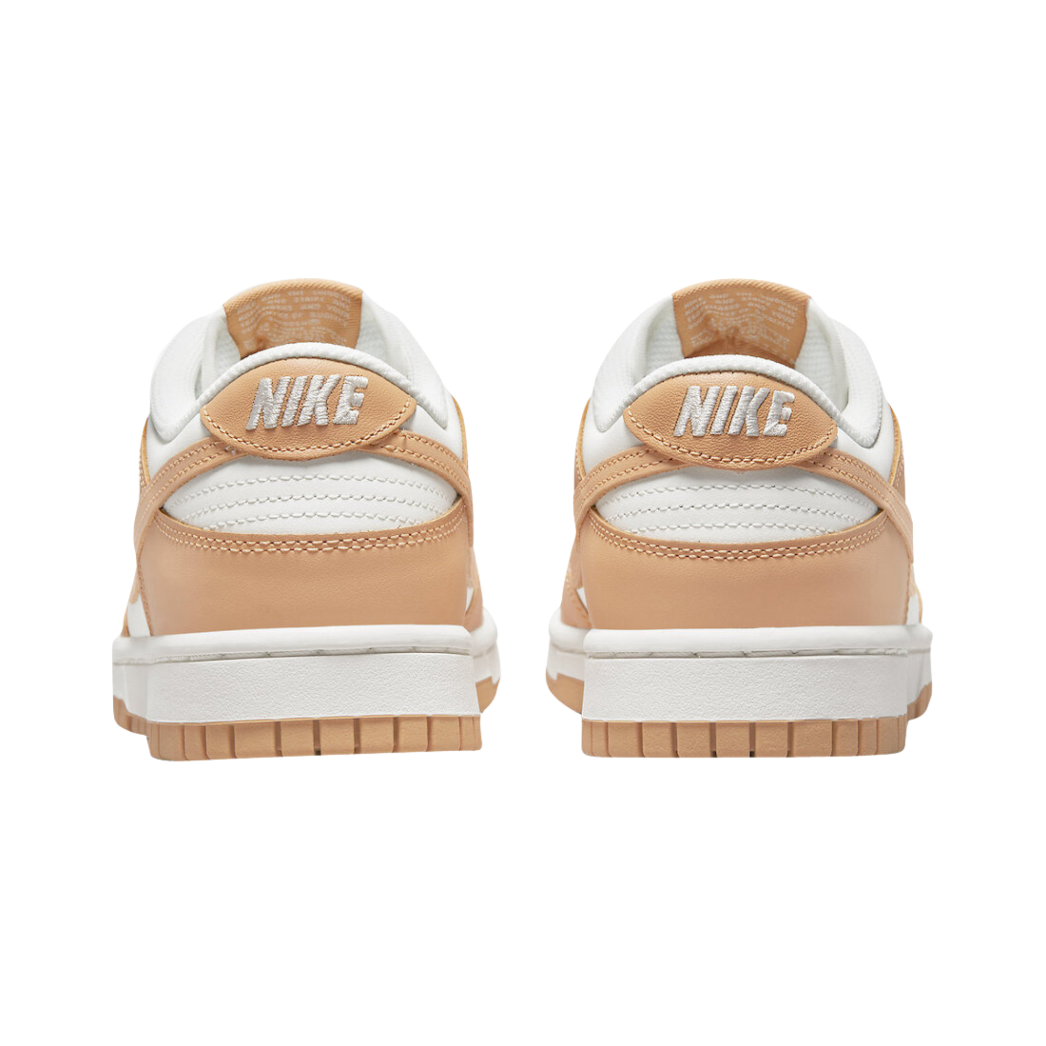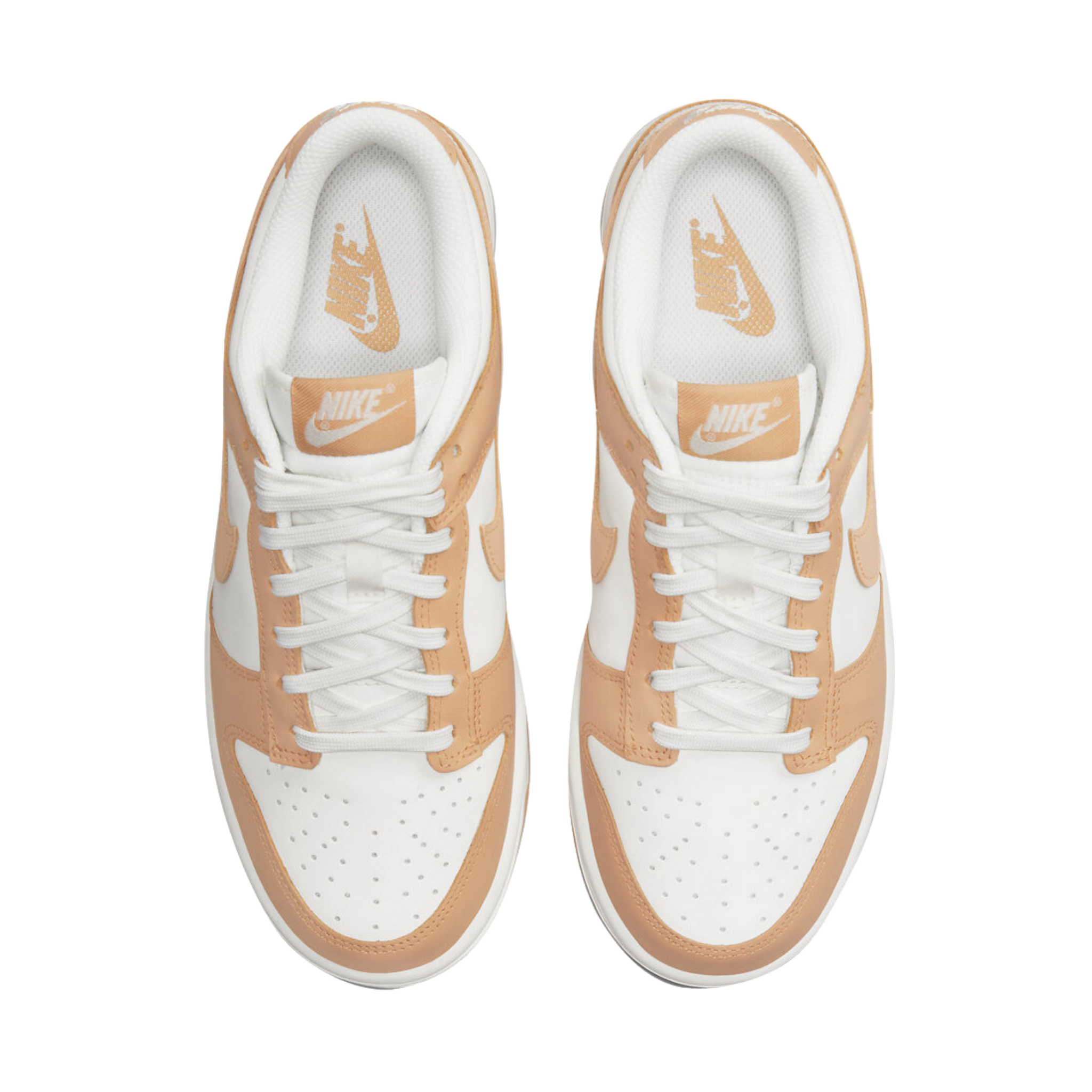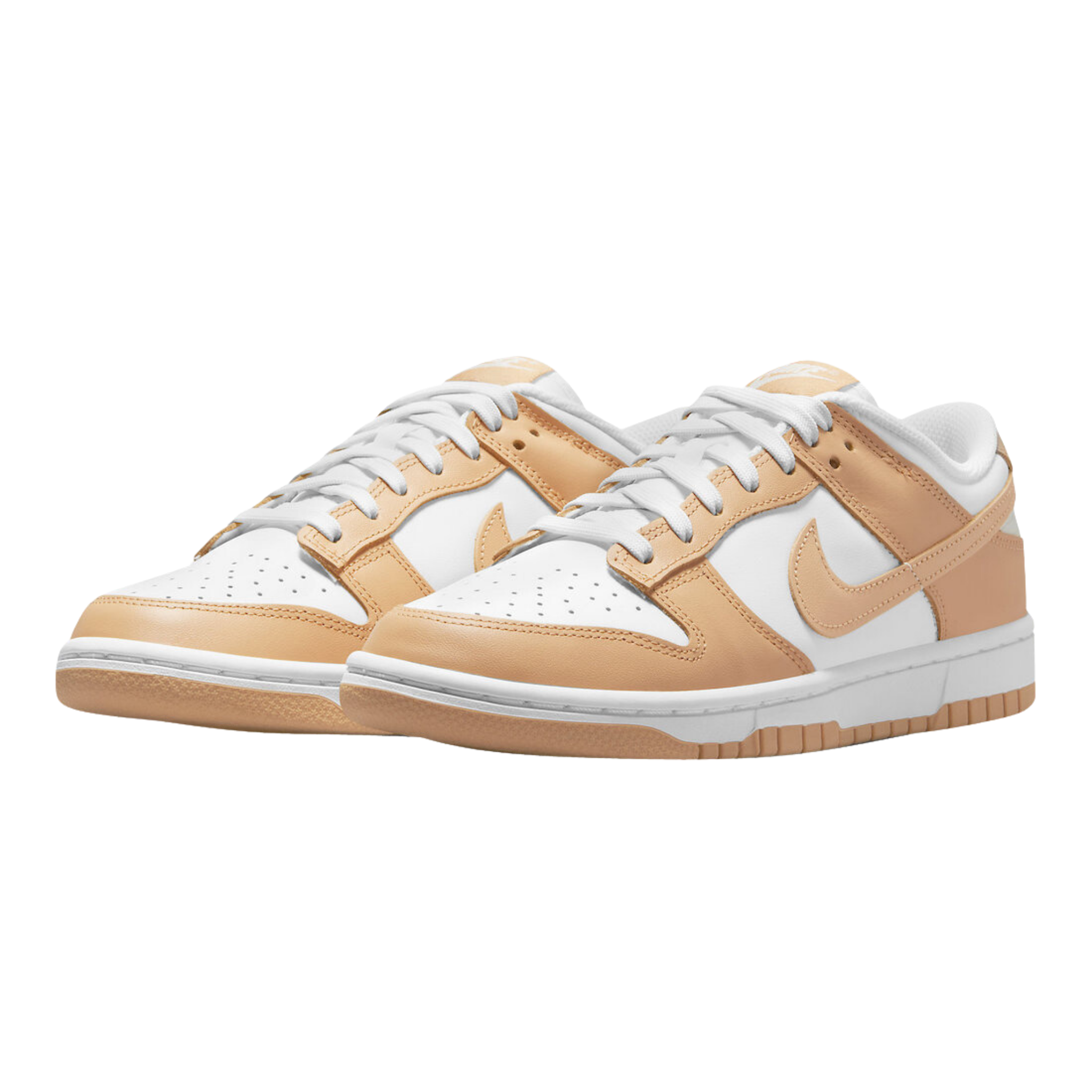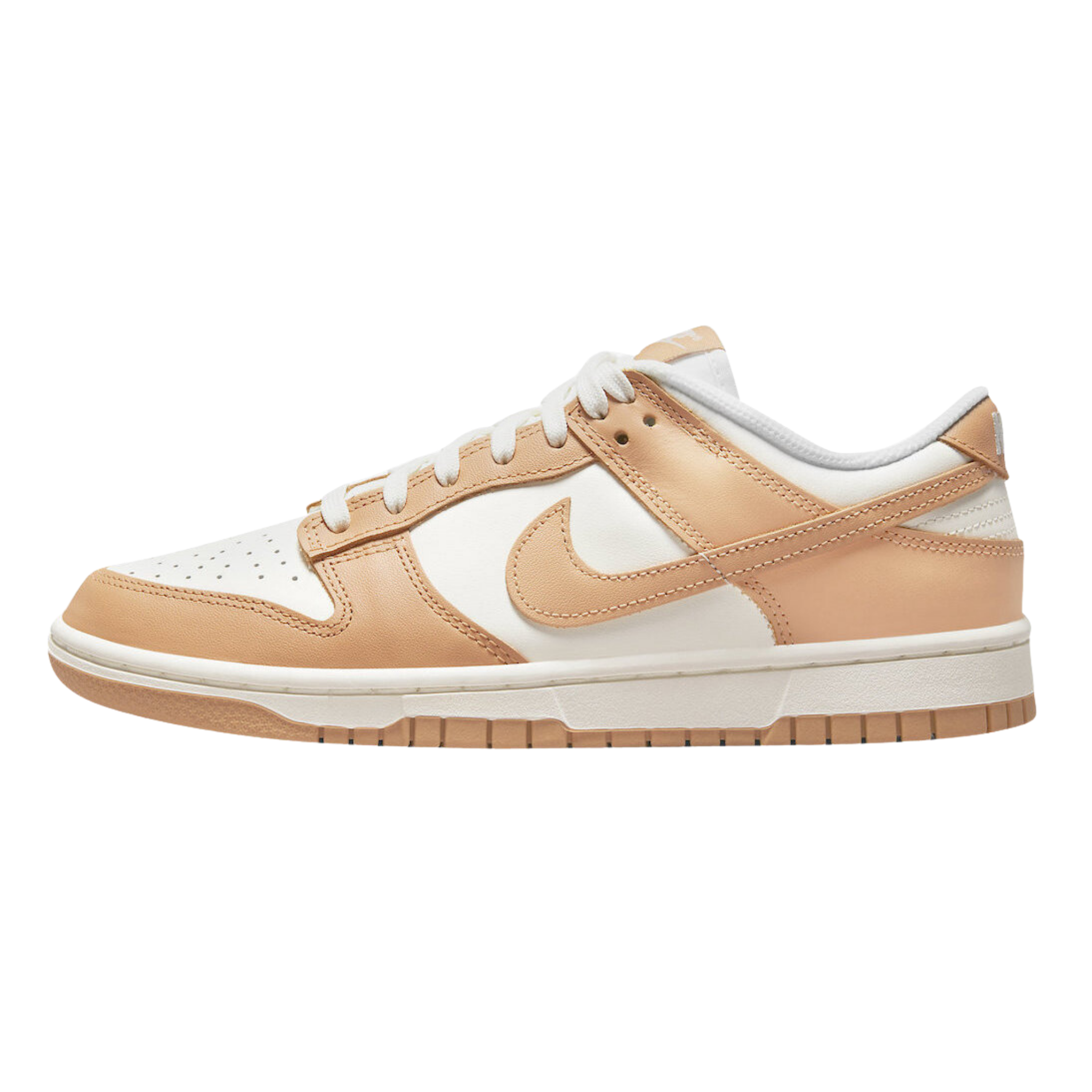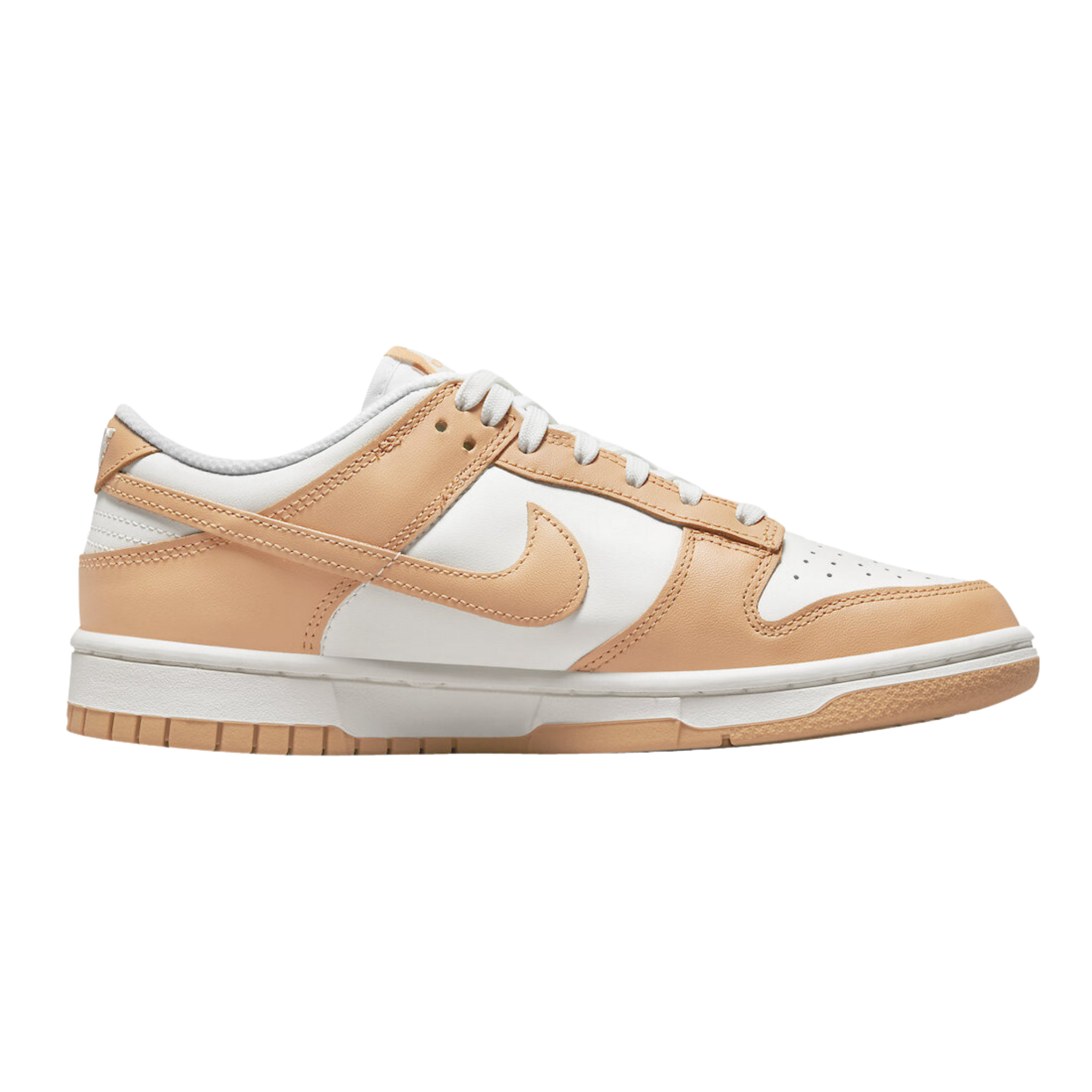 The Nike Dunk Low 'Harvest Moon' is a refined two-tone color scheme for the retro hoops shoe, highlighted by a leather upper that combines a clean white base with contrasting overlays in a subtle peach beige hue. The sneaker has standard Dunk features like a perforated toe box, breathable nylon tongue, and embroidered Nike branding on the back tab.